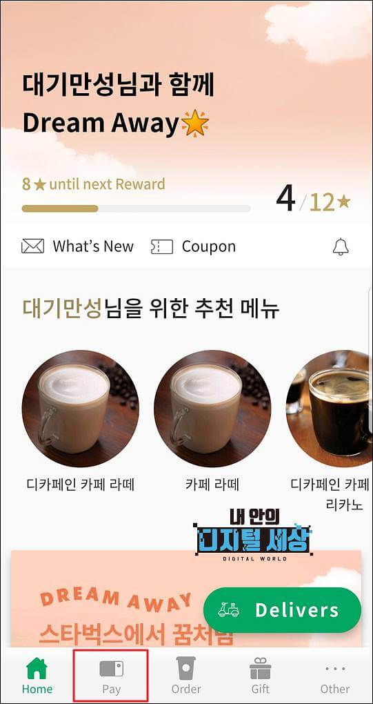 2) 스마트폰에 스타벅스 앱을 실행하여 Pay 메뉴를 선택합니다.