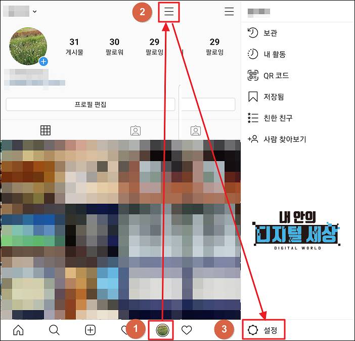3) 인스타그램 자신의 프로필로 들어가서 줄 3개 메뉴를 통해 설정으로 들어갑니다.