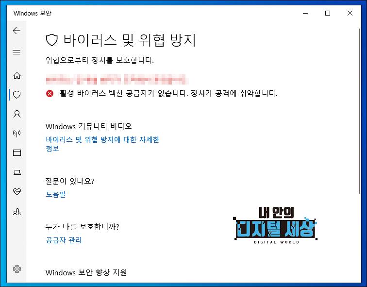 5) 보안 센터 버튼을 누르고 바이러스 및 위협 방지 메뉴를 선택하면 활성 바이러스 백신 공급자가 없습니다. 장치가 공격에 취약합니다. 라고 뜨는 것을 볼 수 있습니다.