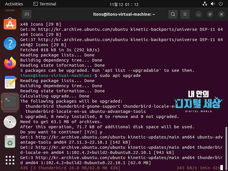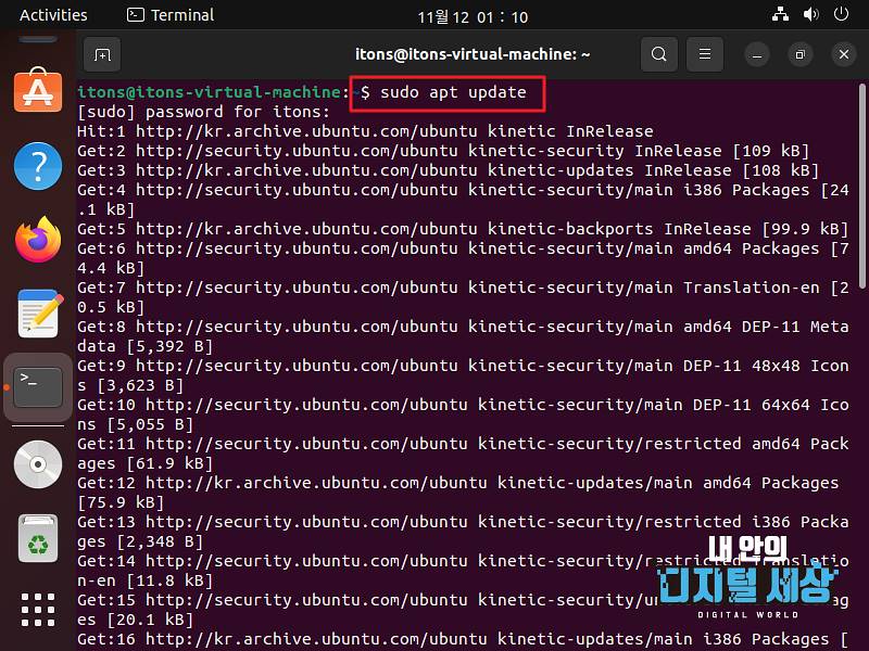 1) 터미널 sudo apt update 명령어 APT 패키지 저장소 캐시를 업데이트합니다.