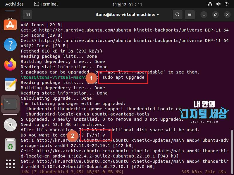 2) sudo apt upgrade 명령어 APT 패키지를 업그레이드합니다.