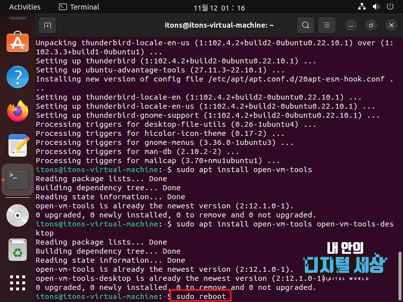 6) sudo reboot 명령어 리눅스 우분투 운영체제를 리부팅하면 끝납니다.