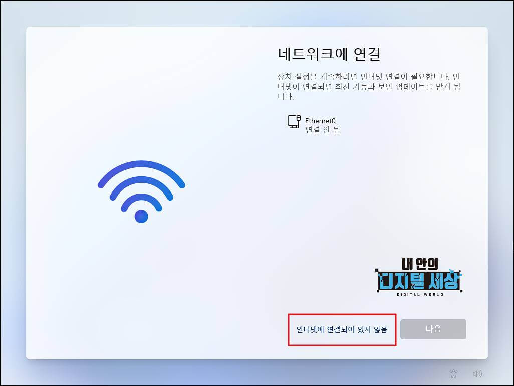 4) 다시 처음부터 기본 환경 구성 완료 단계 중 네트워크 연결 단계에서 인터넷에 연결되어 있지 않음 메뉴가 활성화되어 있는 것을 볼 수 있습니다.