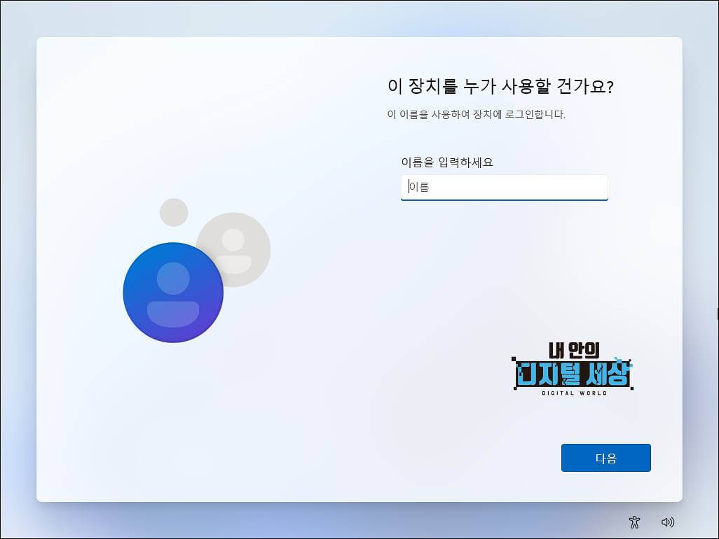 6) 로컬 계정인 사용자 이름을 입력하여 윈도우11 설치 기본 환경 구성을 마무리하면 되겠습니다.