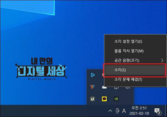 1) 작업표시줄 스피커 아이콘 마우스 오른쪽 누른 후 소리 메뉴를 선택합니다.