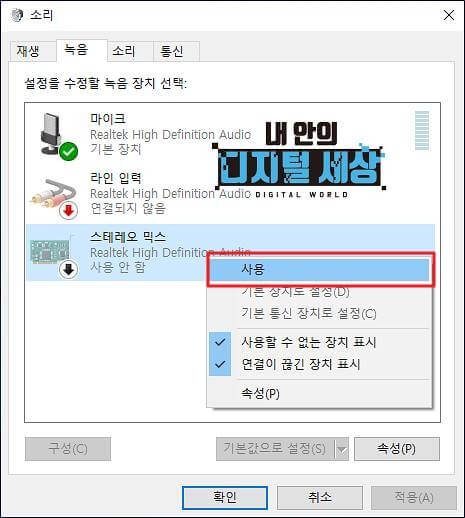 2) 만약 스테레오 믹스가 안보이면 마우스 오른쪽 버튼을 눌러 사용할 수 없는 장치 표시를 선택합니다.